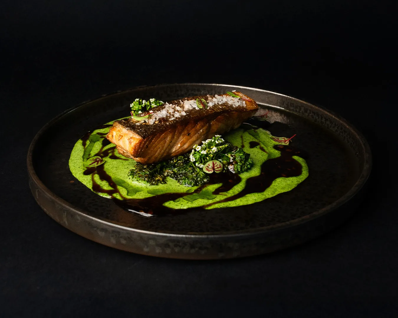 Filet z łososia, krem ze szpinaku ze śmietaną, broccolini, lekki sos na bazie miodu, pomarańczy i imbiru. Wersja dla tych, którzy wolą rybę od mięsa.