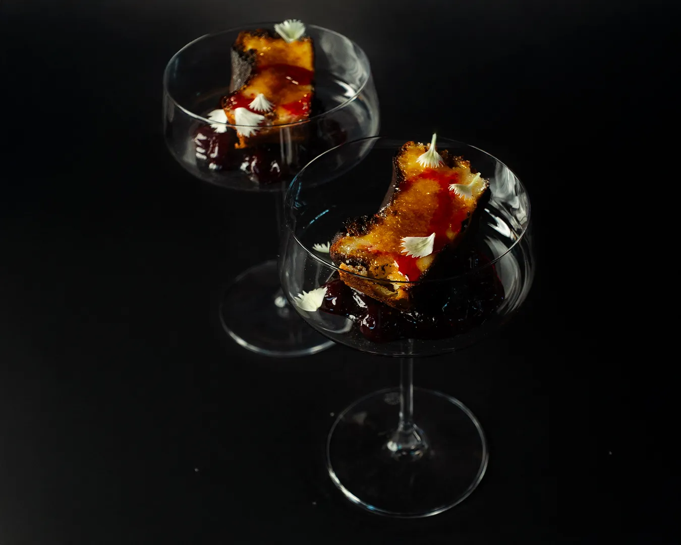 Karmelizowany sernik o aksamitnej, śmietankowej strukturze, podany z sosem wiśniowym. To deser podany jako przystawka – szef kuchni lubi eksperymentować z kolejnością dań.