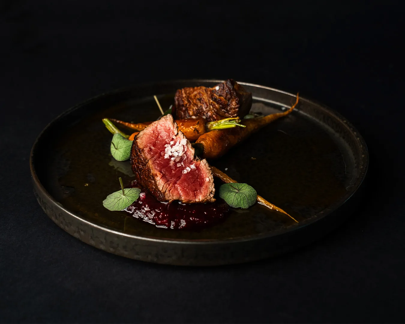 Składniki: wołowina, baby marchewka, sos wiśniowo-winny, masło śmietankowe, rozmaryn