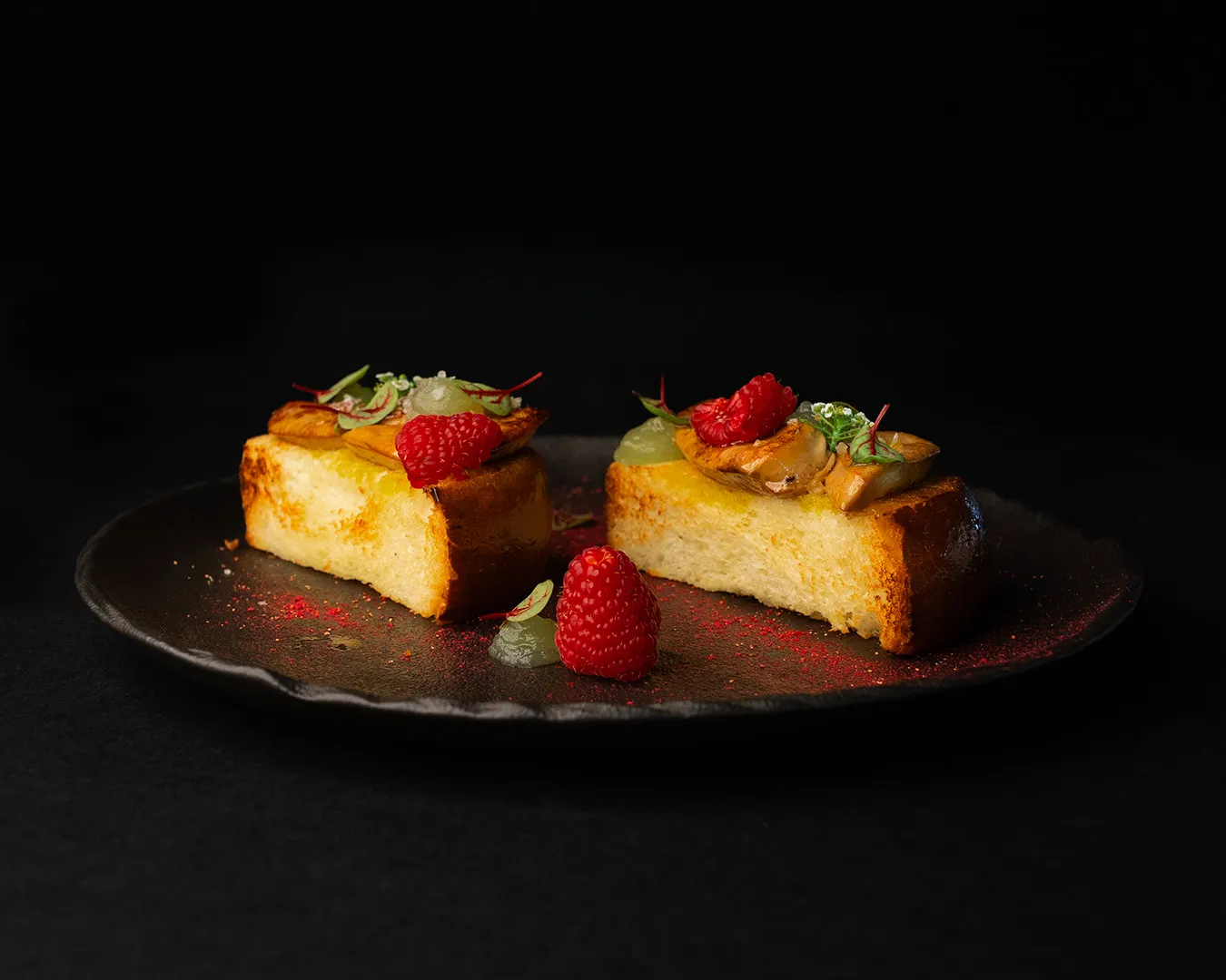 Skład: foie gras, brioche, żel jabłkowy, maliny, masło, tymianek.